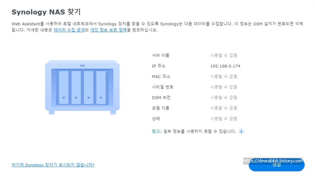 설치 후 나스의 로그인 페이지를 찾을 수 없다면 브라우저 검색창에 Synology Web Assistant (https://finds.synology.com)을 통해서 아래와 같이 확인 할 수 있습니다.