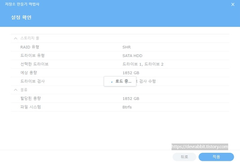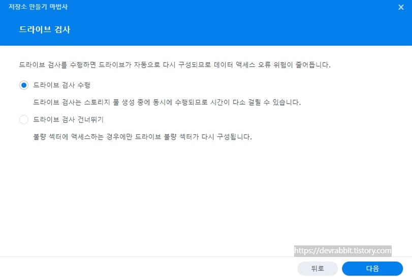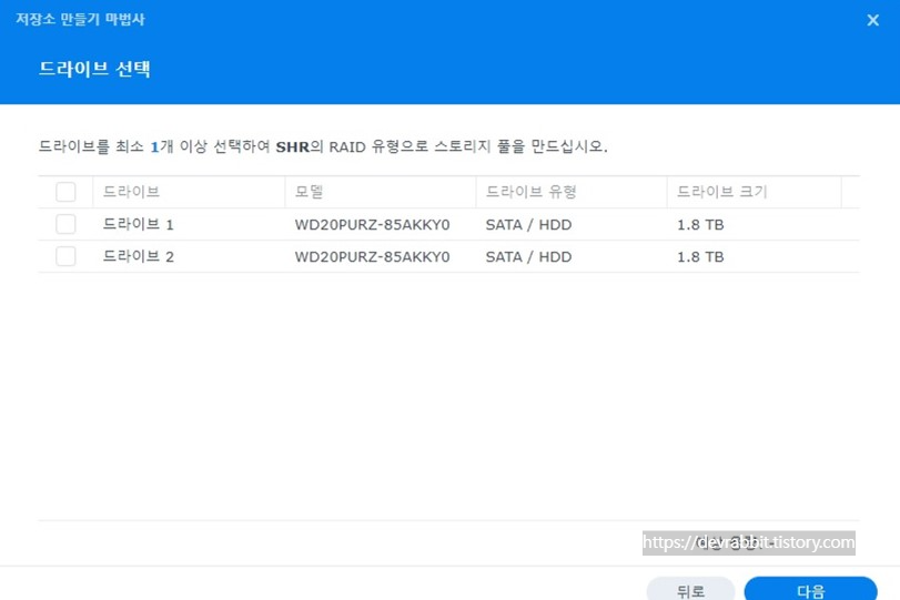 SHR같은 경우는 최소 1개부터 선택이 가능하지만 저는 드라이브를 2BAY 설치하였으니 2개의 드라이브를 모두 선택하겠습니다. (레이드 유형에 따른 장단점은 추후 별도로 포스팅 하겠습니다)