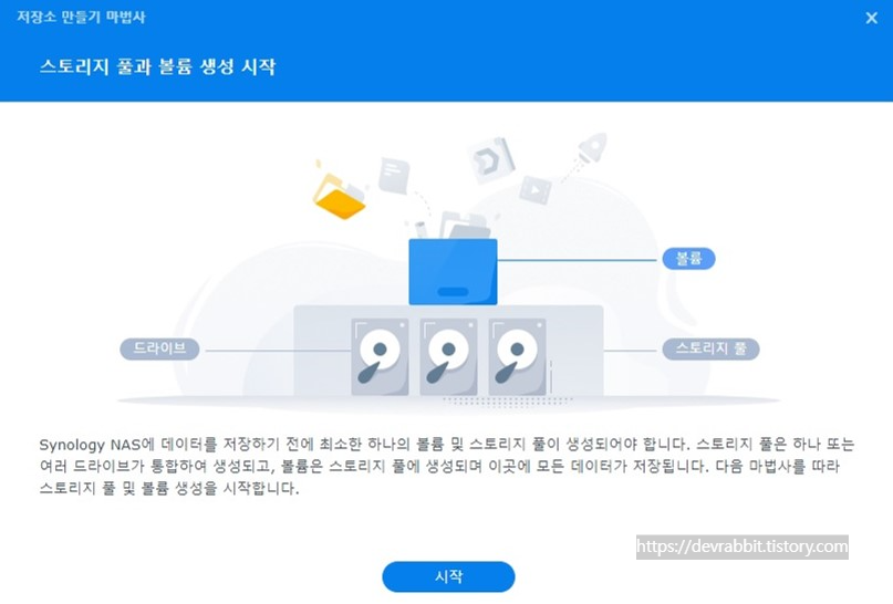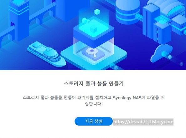 처음 로그인을 하면 나스의 스토리지 풀과 볼륨을 만들어야 합니다.