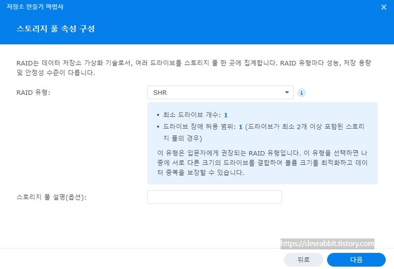 저는 SHR로 구성해 보겠습니다. (개인적으로 저장 자료의 안전을 위해 허용 가능한 드라이브 오류가 1 이상인 레이드 유형의 선택을 추천드립니다)
