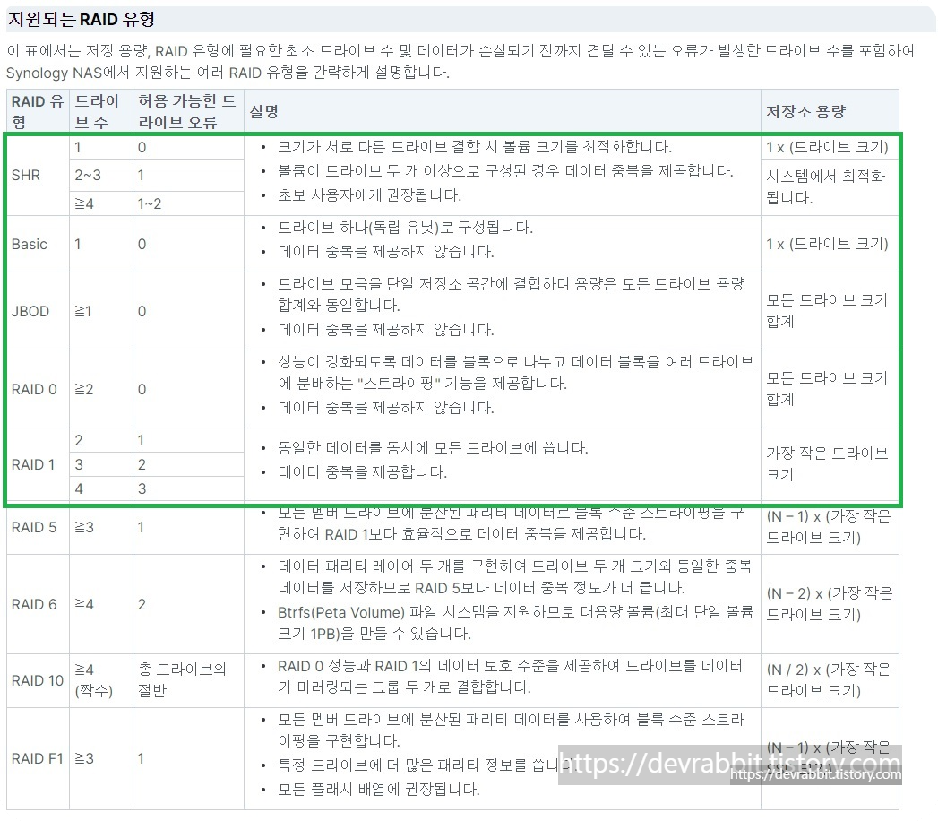 시놀로지에서 제공하는 레이드 유형은 아래 표를 참고하시기 바랍니다. (녹색 표시가 DS220+가 지원하는 레이드 유형)