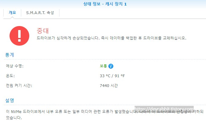 그 중 아래와 같은 M.2 SSD 캐시 수명문제로 1년도 사용하지 못하고(사용시간 7440시간이면 약 310일입니다) SSD 캐시를 사용하지 못하는분들이 있습니다. 특히 읽기/쓰기로 사용할 경우 더 많은 분들이 겪고 있습니다.